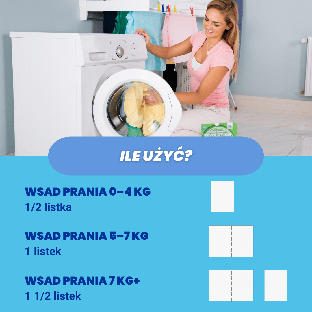 Każdy arkusz zawiera dokładnie taką ilość detergentu, jaka jest potrzebna do standardowego załadunku pralki. Przy mniejszych wsadach wystarczy pół arkusza, a przy bardzo dużych lub mocno zabrudzonych ubraniach można użyć większej liczby arkuszy.